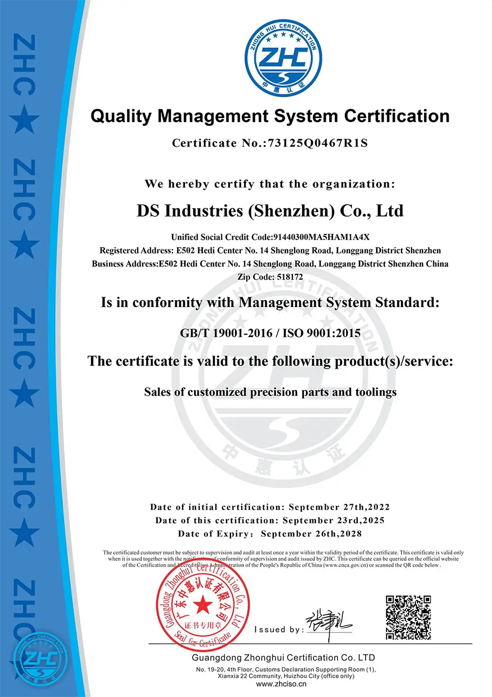 DS Industries follows: ISO 9001 guidelines for quality control. If you receive part that does meet drawing’s specifications, DS Industries will send you qualified parts for free or make full refund for the defective part.